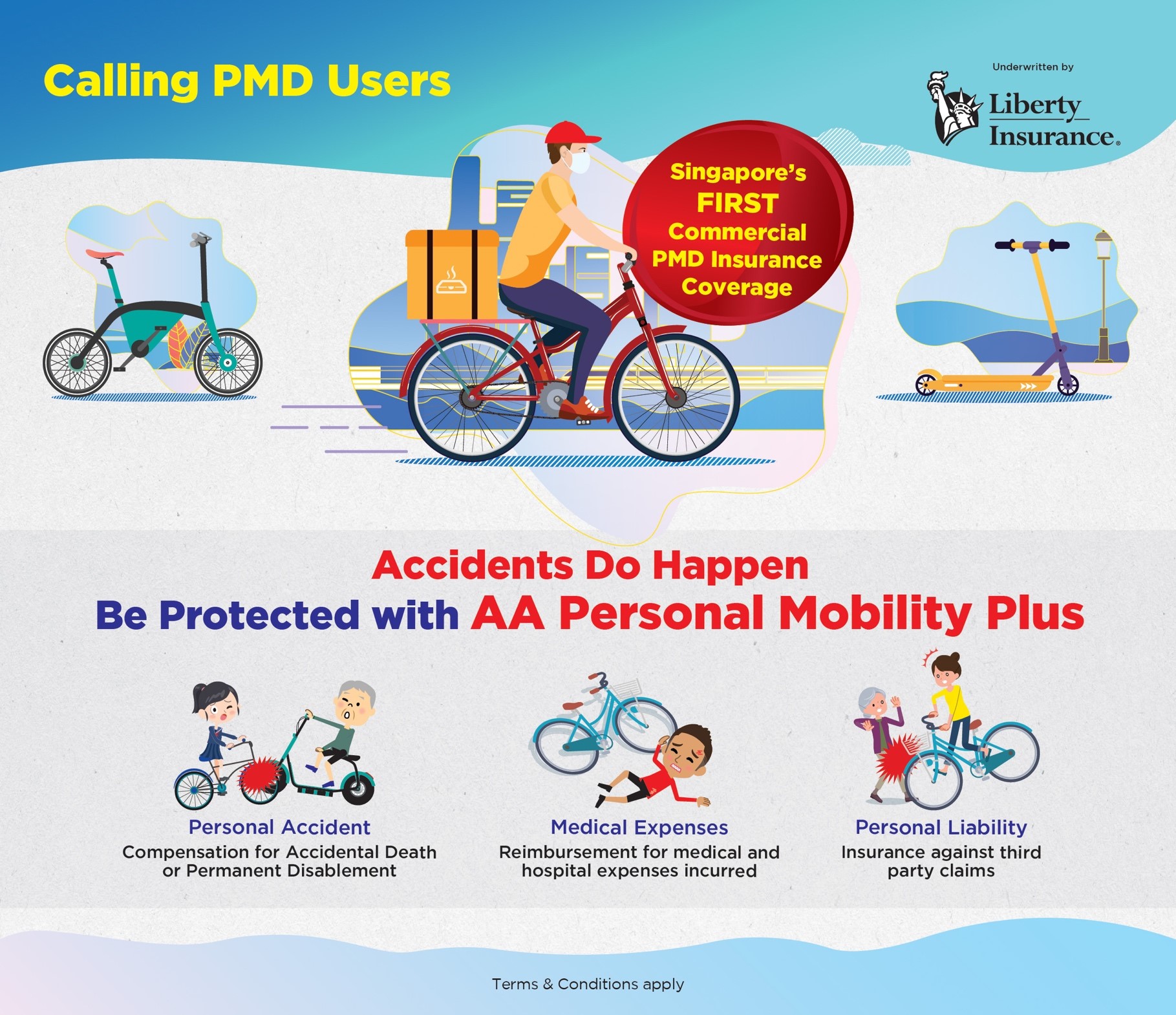 PMD Insurance is a Policy tailored to provide comprehensive cover for users of Personal Mobility Devices (PMD). The Policy is designed to protect You, a user of Personal Mobility Devices (PMD) against costs and expenses You may incur due to third party liabilities arising from your negligent use of the PMD registered in Your name. Coverage also extends to provide for personal accident benefits and Medical Expenses following Accidental bodily injury arising from the use of the PMD.